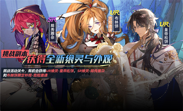 周年庆期间,开启大型副本活动,御侍大人通过挑战活动关卡,有机会获得UR飨灵-皇帝松饼,SR飨灵-腓秀雅杂和布林饼限定外观-危险邀请。