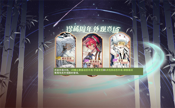 活动描述:周年庆期间,开启限时外观卡池,御侍大人可以抽取UR螺丝意面动态外观-宇宙奇思,SR腓秀雅杂外观-沙洲寻迹,SR拿铁外观-雪原奇遇。另外还有海量活动飨灵外观,全新餐厅装扮等待御侍大人的光临~