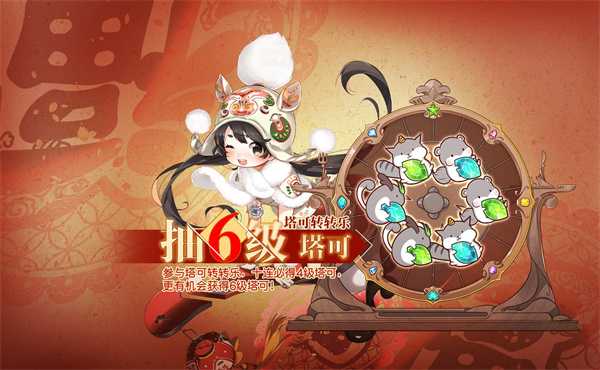 活动描述:周年庆期间,御侍大人可使用喵爪塔可夹,前往塔可转转乐,十连必得4级塔可,还有机会直接获得6级塔可!喵爪塔可夹在道具商城可使用幻晶石兑换,也可在礼包商城进行购买。